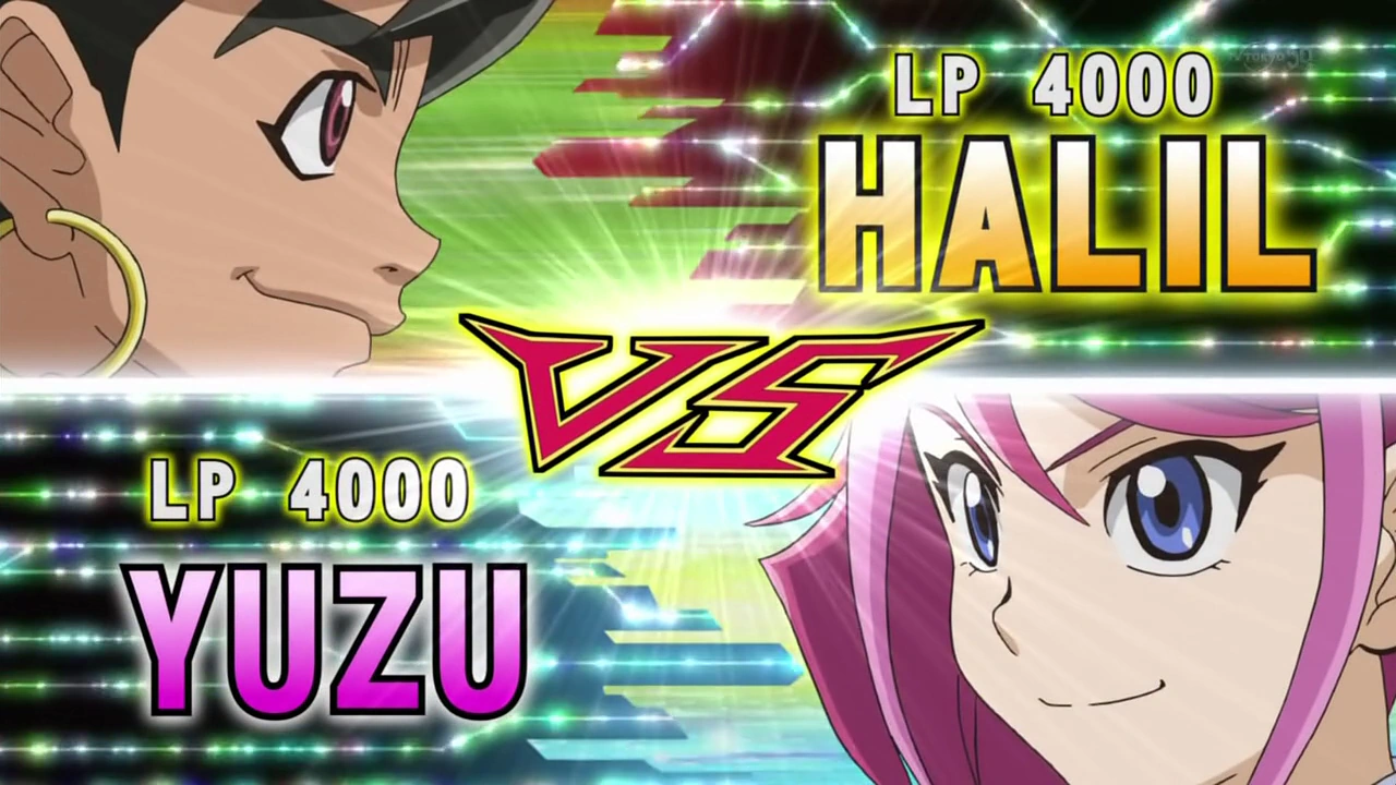 Back at the blizzard-affected area, Zuzu shivers as she appears to have lost direction. A voice responds having heard Zuzu speak, and a boy appears claiming to have burned up after all that running. He recognizes Zuzu and greets her happily, introducing himself as Halil from the Leo Institute's Anatolia campus. He was on exchange studying the Fusion course, and saw Zuzu's victory against course rep Julia Krystal (Julia isn't mentioned in the dub), and wants to put Zuzu to the test. She politely says she doesn't have her second Pendulum Card yet. But Halil offers one to Zuzu, having already picked up three on his way. Zuzu kindly accepts the offer; knowing she has to duel, she tells Halil that she's an entertainer who duels using Fusion Summon. Halil sees this as a great learning opportunity, to which Zuzu agrees. At the stadium, the focus momentarily shifts to the impending duel between Zuzu and Halil. Having wagered their respective cards, Zuzu and Halil begin their duel. Skip encourages his daughter with one of his "fired up" speeches, while the You Show Youths know that they're watching two of their colleagues duel at the same time. But Tate has worries about Yuya, who's still being chased.