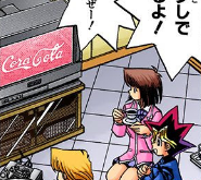 At 5:00, Anzu, Yugi, Jonouchi and Grandpa sit down with some food and drink to watch the Duel Monsters final on TV. In front of the TV is a console, resembling a PlayStation. Just before the show starts there is a Cora-Cola commercial on the TV.