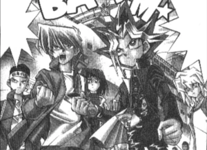 Dark Yugi, Jonouchi, Anzu Mazaki, Honda and Bakura arrive at Duelist Kingdom.
