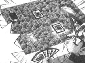 Haga Summons "Killer Needle", with 1200 ATK and Dark Yugi Summons "Mammoth Graveyard", which also has 1200 ATK. Dark Yugi gets "Mammoth Graveyard" to attack "Killer Needle". Having the same ATK, both monsters should be destroyed. At first it seems that only "Mammoth Graveyard" gets destroyed. Haga laughs and asks if Dark Yugi has figured out why he choose the forest as the stage for their Duel. He says that Pegasus gave him a special preview of the new rules and directs Yugi's attention to the board, where the landscape has been reproduced. Haga explains that the landscape from 40 meters has been around the Battle Box is being reflected on the board. In this case its 80% Forest and 20% Wasteland. Since Haga's Insects thrive in the forest, they get a Field Power Source, increasing their ATK and DEF when played in the forest. He laughs that Dark Yugi can't win against his Insects. However Dark Yugi smirks and tells Haga to take another look at his monster. "Killer Needle" had also been destroyed in battle because "Mammoth Graveyard" also got a Field Power Source from the Wasteland. Dark Yugi then claimed to have figured out the Field Power Source rule, the moment he sat down at the table.