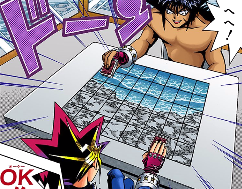 They use a Battle Box on a cliff for their Duel. Kajiki's side of the field is Ocean, while Dark Yugi's is Wasteland. Each player bet two Star Chips and the Duel started.