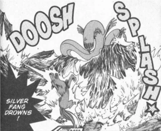 Kajiki laughs about how nobody can defeat him at sea. Dark Yugi admits that he is strong and cannot see any holes in his attack or defense. He wonders if there is any way to shatter the gigantic immeasurable fortress of water that is the ocean. For now, he thinks that his strategy will have to be to fall back as far as he can. He Summons "Silver Fang" and activates "Mystical moon" to make him "savage". This increases its ATK and DEF from 1200 and 800 to 1560 and 1040. Kajiki laughs that he's only wasting his Life Points with that kind of card and the he can't overcome the power of the sea.