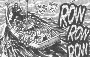 Dark Yugi notices a boat of Duelists leaving the island. The boat is captained by one of Pegasus' suits. Among the evacuees are Insector Haga and the boy who had his Star Chips stolen. Haga demands that the others give them space, reminding them that he is the champion of Japan. The other boy looks at Haga and wished his Star Chips had not been stolen.