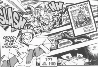 The thief Summons "Man-Eating Plant", which has 800 ATK, but Dark Yugi counters with "Winged Dragon, Guardian of the Fortress", which has 1400 ATK. The dragon attacks from the sky and defeats the plant, dropping the thief's Life Points to 1400. The thief gulps and proceeds to Summon "Crocodilus", which has 1100 ATK. This time Dark Yugi counters with "Celtic Guardian", which has 1400 ATK. It cuts "Crocodilus" in half, destroying it and dropping the thief's Life Points to 1100. The thief sees that he's in real danger of losing.