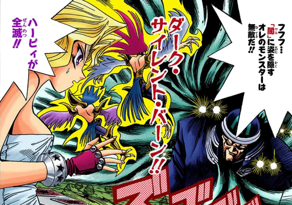 Elsewhere the strange man Duels Mai. His monster hidden in the darkness uses "Dark Silent Burn" to defeat her "Harpy Lady" cards, dropping Mai's Life Points to 0. The man laughs that the Darkness gives his cards power and Mai thinks that there is no way to beat an opponent who hides in the dark and cannot be seen. The man demands Mai to hand over her Star Chips and get off the island in accordance to the rules.