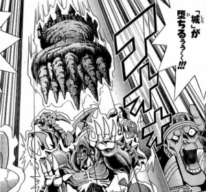 As "Gaia the Dragon Champion is fired, its ATK becomes 3100. "Gaia" hits "Castle of Dark Illusions" directly, but is killed in the process, causing Dark Yugi to lose Life Points equal to half his ATK, dropping him to 300. The flotation ring around the castle is shattered, while the castle itself remains unharmed.