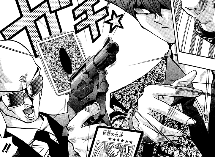 Kaiba looks out the window and notices that the moon is now on the opposite side of the helicopter than it was before, meaning that he has been flying around in circles. He realizes that the guard and the helicopter pilot have also defected to Pegasus. The guard sees that Kaiba has noticed and points a gun at him. He confirms that he has switched sides and says that Kaiba has to die and sink to the bottom of the sea now. He asks if Kaiba is ready, to which he replies that he would like to get his cards out of the way so they do not get blood on them. The guard allows for it, commenting that Kaiba really is the lord of the cards. He says that those are Kaiba's last words and prepares to shoot him. However Kaiba quickly jams one of the cards he took, "Gyakutenno Megami", into the gun, blocking its hammer and preventing it from firing. He berates the guard for making him damage a rare card and before the guard has time to react, Kaiba grabs the gun, snapping the guard's finger in the process. Kaiba says that if they want to kill him, they will have to kill the cards too. He then orders guard and pilot to jump out of the helicopter into to sea, threatening to kill them otherwise. He bids farewell to the two men and continues to fly to the island himself.