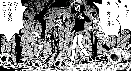 Elsewhere in the cave, Dark Yugi, Anzu, Honda and Bakura continue their search for Jonouchi. Anzu notices that there are skulls on the ground, after she nearly trips over one. Honda concludes that this is bad; Jonouchi will not be okay if he is Dueling in a place like this and could be fighting cannibal cavemen. Dark Yugi hopes that Jonouchi remembers their promise; that they came to the kingdom to save Sugoroku and Shizuka. At the Duel, Jonouchi seems to have heard what Dark Yugi was thinking. He vows not to give up and draws his card, saying he has to protect something important to him and vowing to win by himself.