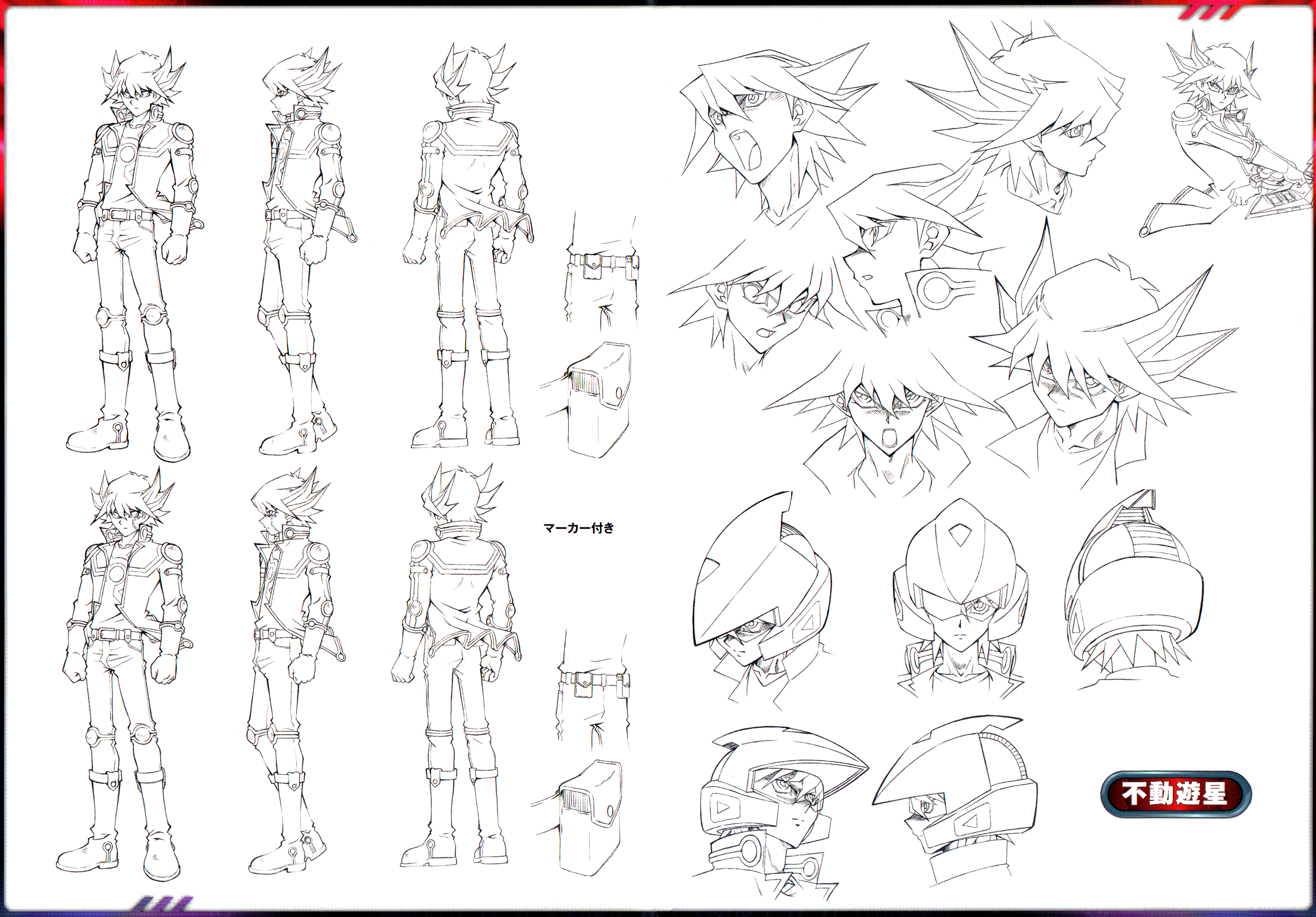 Yusei has tan skin, a somewhat muscular looking physique, black hair with gold highlights, and royal blue eyes. The upper layer of his hair juts upward while the lower layer arches down. According to Kazuki Takahashi; Yusei's hairstyle was based on Takahashi's own bedhead, and completes a "rock, paper, scissors" theme shared with Yugi Muto and Jaden Yuki.[4]