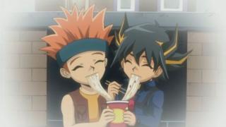 The two have very similar interests, the first and foremost being the upgrading of Duel Runners, and due to this, they bonded very fast, to the extent that when they were doing a project, they were so absorbed in their own work that they didn't even notice anyone else's presence in the room.[32] Yusei is shown to care about Bruno, first not wanting to believe he is Antinomy.[33] After the second Duel with Antinomy ended with Yusei's win, he tried to prevent Bruno from being sucked into the black hole. However, Bruno sacrificed his life to save Yusei, which left Yusei in tears while screaming his name.[21] Yusei actually kept Bruno's glasses, which is shown in the final image on the extended ending.