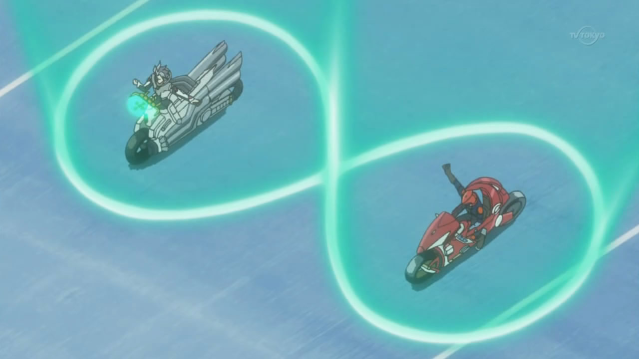 Yusei watches Akiza during her Duel Runner lessons, and helps her improve and learn various Duel Runner tricks. When Akiza passes her Turbo Dueling exam by Dueling Trudge, Yusei congratulates her and welcomes her to the world of Turbo Dueling.