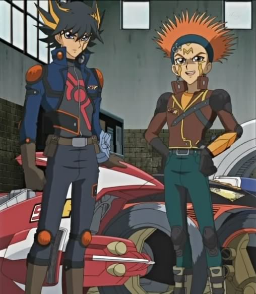 During the WRGP, he gets a new Turbo Dueling outfit that is similar to his old clothes but is more form-fitting. The new outfit consists of the same blue jacket with amber gems, but the flared bottom is replaced by a black strap with an orange outline. He wears blue jeans with amber gems at the knees and knee-high boots.